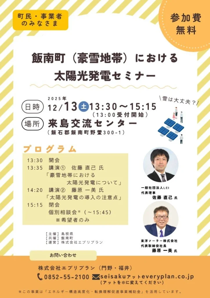 島根県飯南町来島センターで開催された「飯南町(豪雪地帯)における太陽光発電セミナー」において、「豪雪地帯における太陽光発電について」というテーマで講演させていただきました。